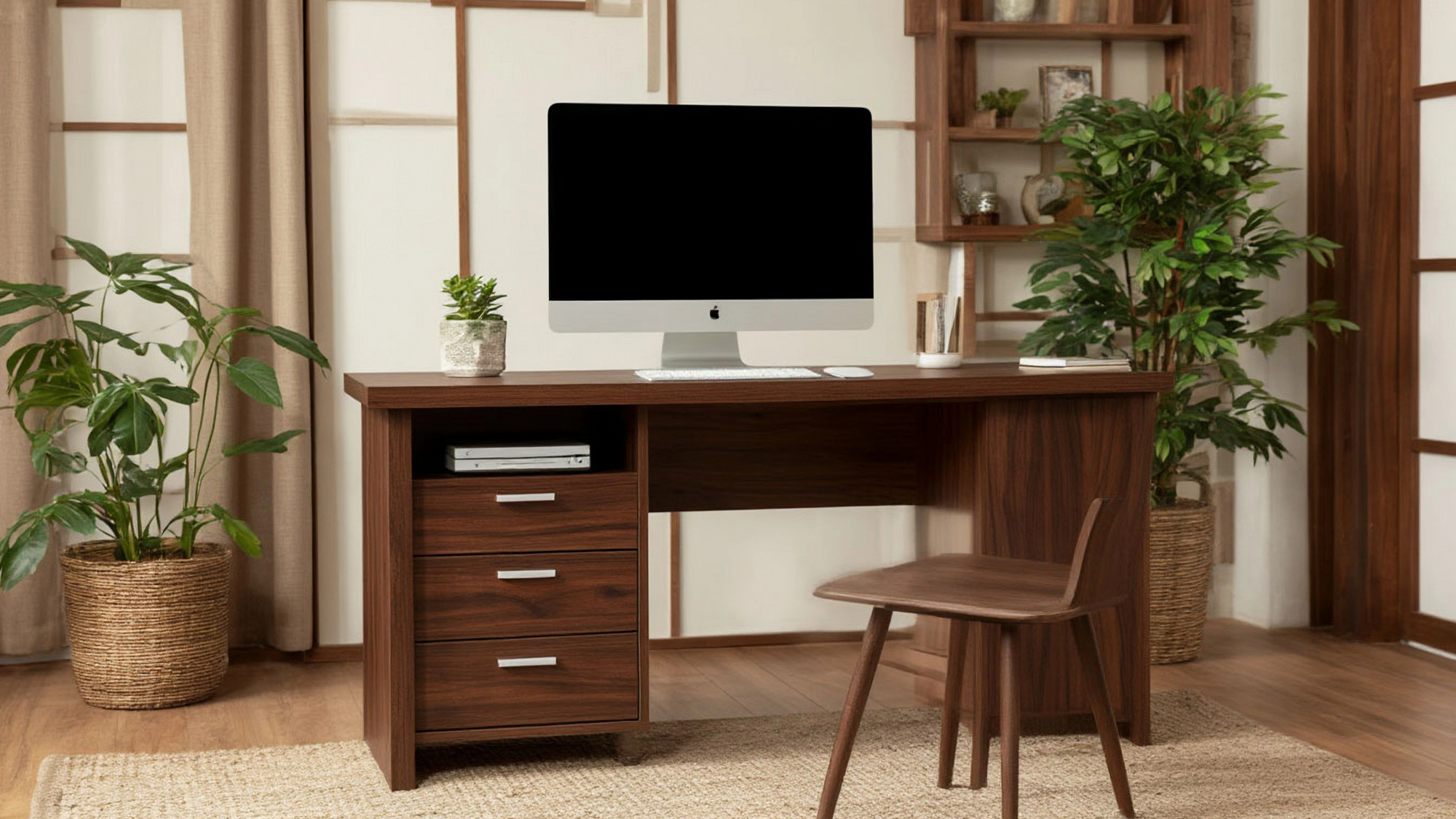 Одной из самых привлекательных черт данного стола является его насыщенный ореховый цвет. Этот теплый и глубокий оттенок придаёт помещению особую атмосферу уюта и спокойствия, что особенно важно для поддержания концентрации во время работы. Ореховый цвет также легко сочетается с различными стилями интерьера — от классического до современного. Это позволяет использовать стол в любом помещении, будь то офис, домашний кабинет или учебное пространство.