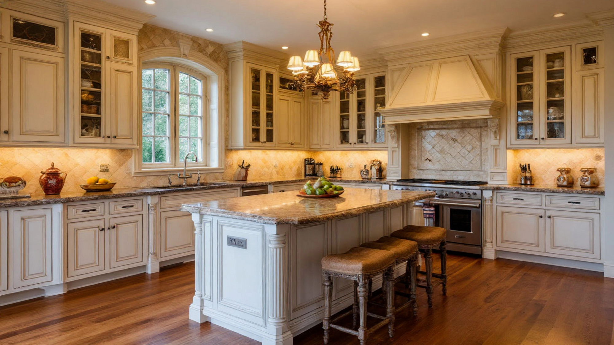 Фасады кухни выполнены из высококачественных материалов с эффектной текстурой, имитирующей натуральное дерево. Цветовая гамма сочетает светлые и тёплые оттенки, которые мягко отражают свет и создают ощущение простора и лёгкости. Остров контрастного, но гармонирующего цвета выделяется как центральный элемент, задавая ритм интерьеру и структурируя пространство. Эстетические особенности классического стиля проявляются в декоративных деталях фасадов, плавных линиях, аккуратной филёнке и утончённой отделке ручек, что подчёркивает утончённость и богатство дизайна.