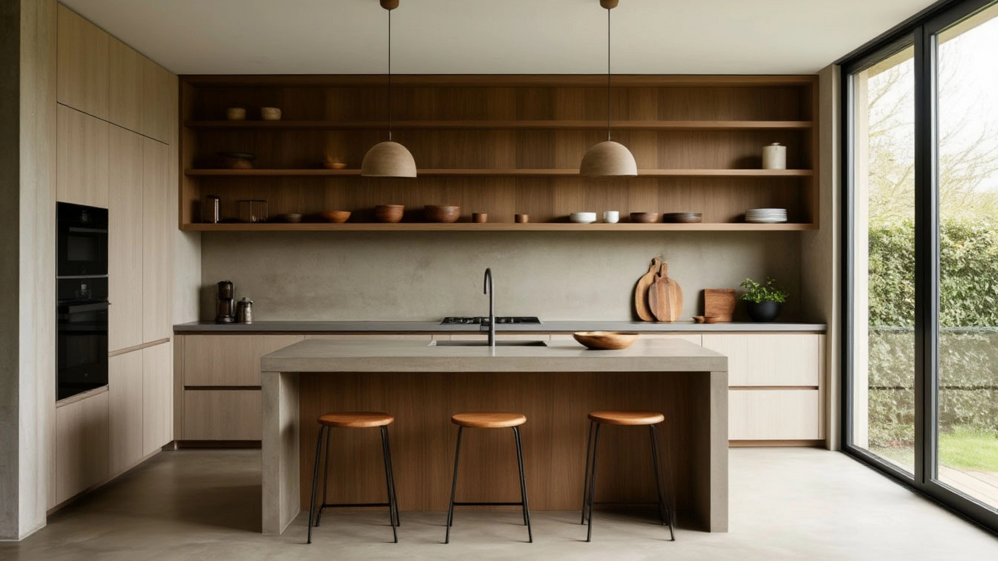 Отдельного внимания заслуживает продуманная система хранения. Несмотря на то, что кухня без навесных шкафов кажется легкой и визуально свободной, она остается функциональной. Вместительные нижние модули, глубокие выдвижные ящики, продуманное деление зон — все это помогает разместить необходимое с удобством. Механизмы открывания работают плавно, тихо и надежно, обеспечивая комфорт в ежедневном использовании. Ящики легко выдерживают нагрузку, направляющие позволяют открывать их полностью, а внутренние разделители помогают поддерживать порядок. При желании на открытых полках можно хранить не только базовые предметы, но и элементы декора — посуду, книги о кулинарии, небольшие растения, что делает интерьер более живым и индивидуальным.