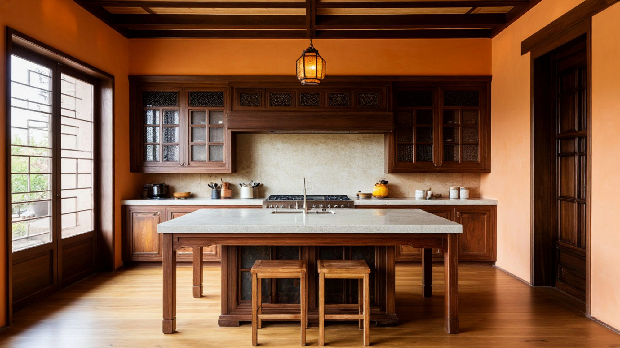 Особое внимание уделено рабочим поверхностям. Столешницы выполнены из прочных материалов, устойчивых к влаге и механическим повреждениям, а их текстура и цвет подчеркивают восточный характер интерьера. Пространство рабочей зоны максимально открыто, что позволяет использовать кухню одновременно для приготовления пищи, сервировки и общения с близкими. Встроенная техника гармонично интегрирована в интерьер, сохраняя чистые линии и эстетику восточного стиля. Варочная панель, духовка, холодильник и посудомоечная машина располагаются таким образом, чтобы все было под рукой и не нарушало визуальной гармонии.
